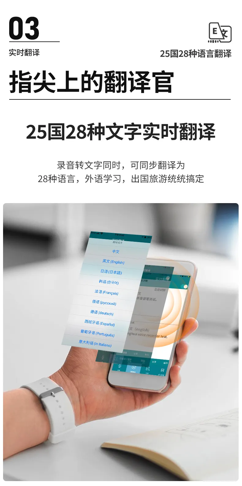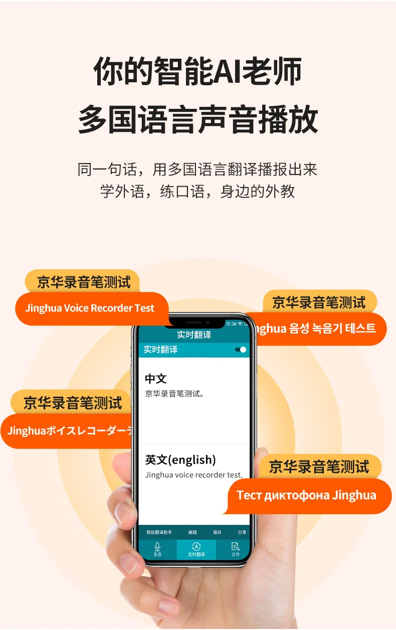 高清原聲音質,AI降噪體驗,拾音速記轉寫,25國同聲轉譯,支持邊充邊錄