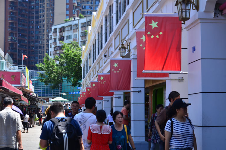 經過口岸邊檢檢查完畢后,才算是真正進入到中英街景區內。一條窄小細長的小巷指引著前來觀光的客人大步邁進,這就是著名的“一街兩制”的中英街。細細品味街區的獨特文化,一點點揭開它的神秘面紗。小巷的一邊是香港生活的寫照,繁體字的街邊店鋪和建筑物把香港的文化和中英街回歸祖國前的歷史面貌展現得淋漓盡致。小巷的另一邊,則完全是中國元素的印記,一排排的小樓房整齊劃一地漆上了干凈、整潔的大白漆,墻上插滿了一面面的中國國旗,顯得如此的昂揚、豪氣。