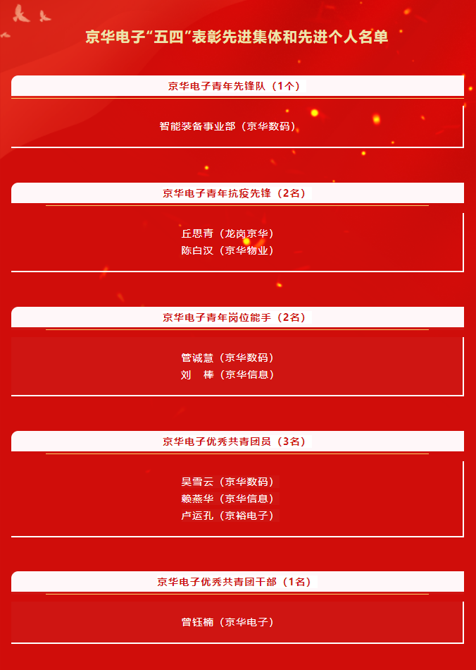 會上,公司黨委副書記、紀委書記羅云水宣讀了《關于京華電子“五四”評優表彰的決定》,希望受表彰的集體和個人,倍加珍惜榮譽,繼續發揚成績、再接再厲,奮進新征程、爭創新業績。希望公司各團支部和全體團員青年、團干部要以先進集體和個人為榜樣,緊緊圍繞公司中心工作,立足本職,發揮青年優勢,進一步解放思想、堅定信心、主動作為,為公司高質量發展貢獻青春力量。