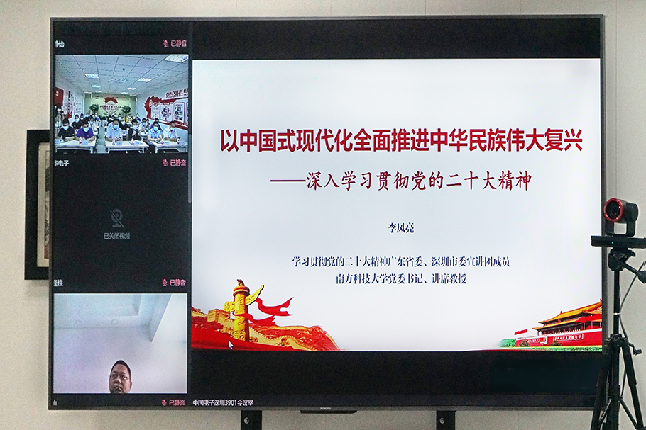 會議邀請了學習貫徹黨的二十大精神廣東省委宣講團成員、南方科技大學黨委書記李鳳亮教授作《以中國式現代化全面推進中華民族偉大復興——深入學習貫徹黨的二十大精神》報告。李鳳亮教授從認真學習領會黨的二十大的主題及其重大意義,準確把握大會確定的重要思想、重要觀點、重大戰略、重大舉措,深刻認識當前的機遇與挑戰,以及為中國式現代化作出廣東貢獻、體現深圳擔當等四個方面,對黨的二十大精神進行了深入解讀、深刻闡釋和權威輔導。