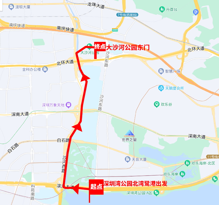 本次徒步路線以深圳灣公園北灣鷺港為起點,穿越大沙河生態長廊,以大沙河公園東門為終點,全程約6公里。深圳灣公園是深圳著名的濱海休閑帶景觀,與香港隔海相望。大沙河,享有“深圳塞納河”的美譽。其西岸是南山科技園區,匯集了眾多世界知名的高科技公司,是深圳最富活力和創造力的地方之一。